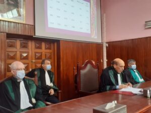 كما تطرق  المسؤول القضائي إلى المجهودات التي بدلتها محكمة الاستئناف بسطات والمحاكم الابتدائية التابعة لها خلال سنة 2021 لتصريف القضايا الرائجة بها إذ أن جائحة كورونا لم تثن السادة القضاة وكتاب الضبط والمحامين وباقي مساعدي القضاء على الاستمرار في سير عمل محاكم الدائرة القضائية بسطات وتم إصدار القرارات والأحكام في مجموعة كبيرة من الملفات والتي من بينها قضايا المعتقلين الاحتياطيين هذه النوعية من القضايا التي فعلت فيها المحاكمة عن بعد أي عن طريق التناظر المرئي المعلوماتي وذلك من قاعة الجلسة بالمحكمة إلى السجن الذي يتواجد به المعتقل وهكذا فإن المحاكمة عن بعد التي تم تفعيلها بمحاكم الدائرة القضائية لسطات خلال سنة 2021 طبقت في 908 جلسة وصدرت في مجموع هذه الجلسات أحكام جنائية وجنحيه في 18629 قضية تتعلق ب 20721 معتقل.